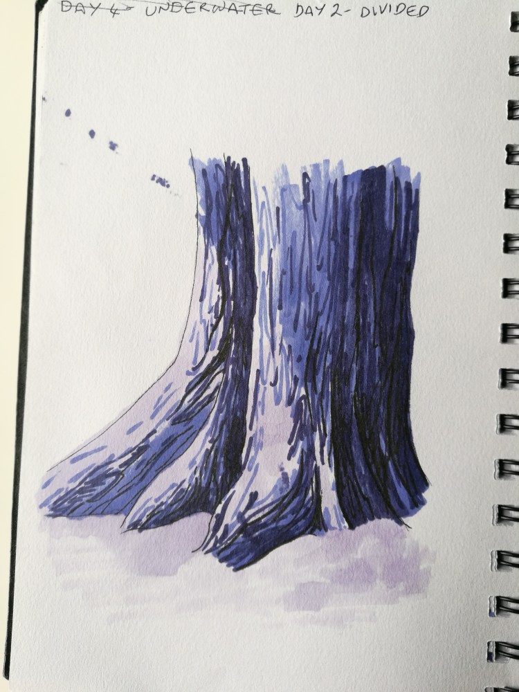This morning I was walking my puppy, and I saw a tree trunk with very clear contrast between where the light was hitting it and the shadows. Since I’m focusing on a nature theme this Inktober (based on the prompt words) I decided to interpret divided as the distinction between the light and the dark areas. (Also yes, I totally misjudged the ink bleeding when labelling the pages.)