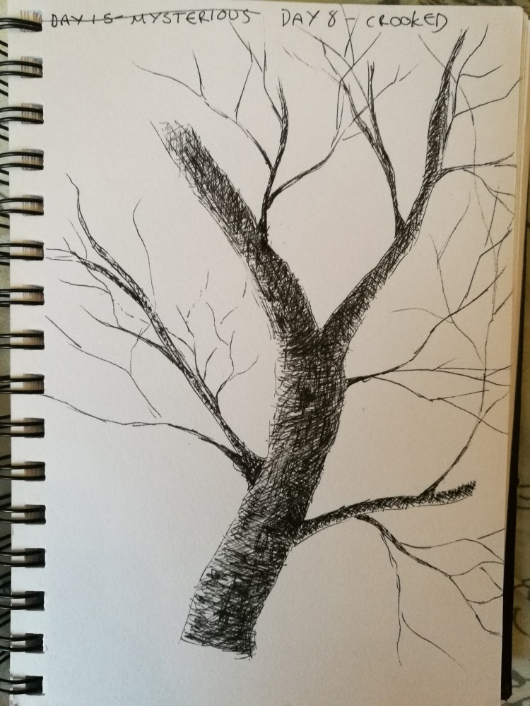 I started it on the train home but there was waaay too much movement so it just wasn’t working. Again, today was a no-coliur piece. Yesterday I wasn’t totally happy with the bark, and when I hear the word “crooked” I immediately think of a creepy autumn tree, so I thought it was a good chance to practice. I’m still not really happy with it, but it’ll do for my entry today.