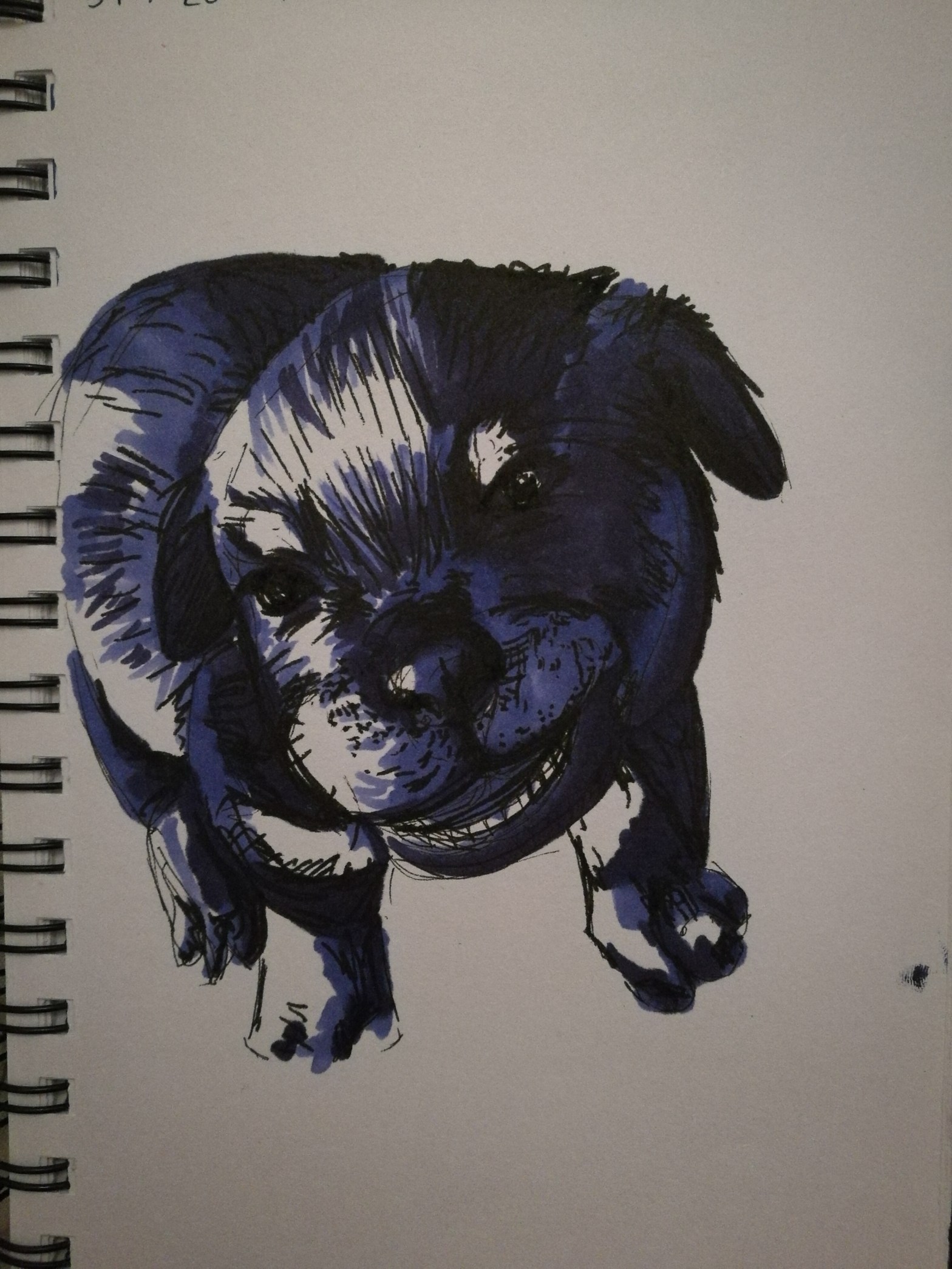 I was trying to do a “fierce” puppy, but it’s much too dark. I wanted to still use colour today, but since I don’t have my lightest shade of purple (it ran out) I only had the midtone and the veeery dark. I also was very lazy when doing the initial sketch. I guess that happens after a 6 day working week. Oh well, it’s an entry anyway! Does anyone else find dogs much harder to sketch than other animals like cats?