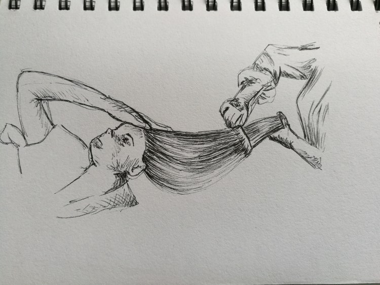 I loved the movement in it, and thought that trying to get the proportions right with just pen would be good practise. You can see where I’ve tried to change things with the hands, but I’m happy with how it came out.