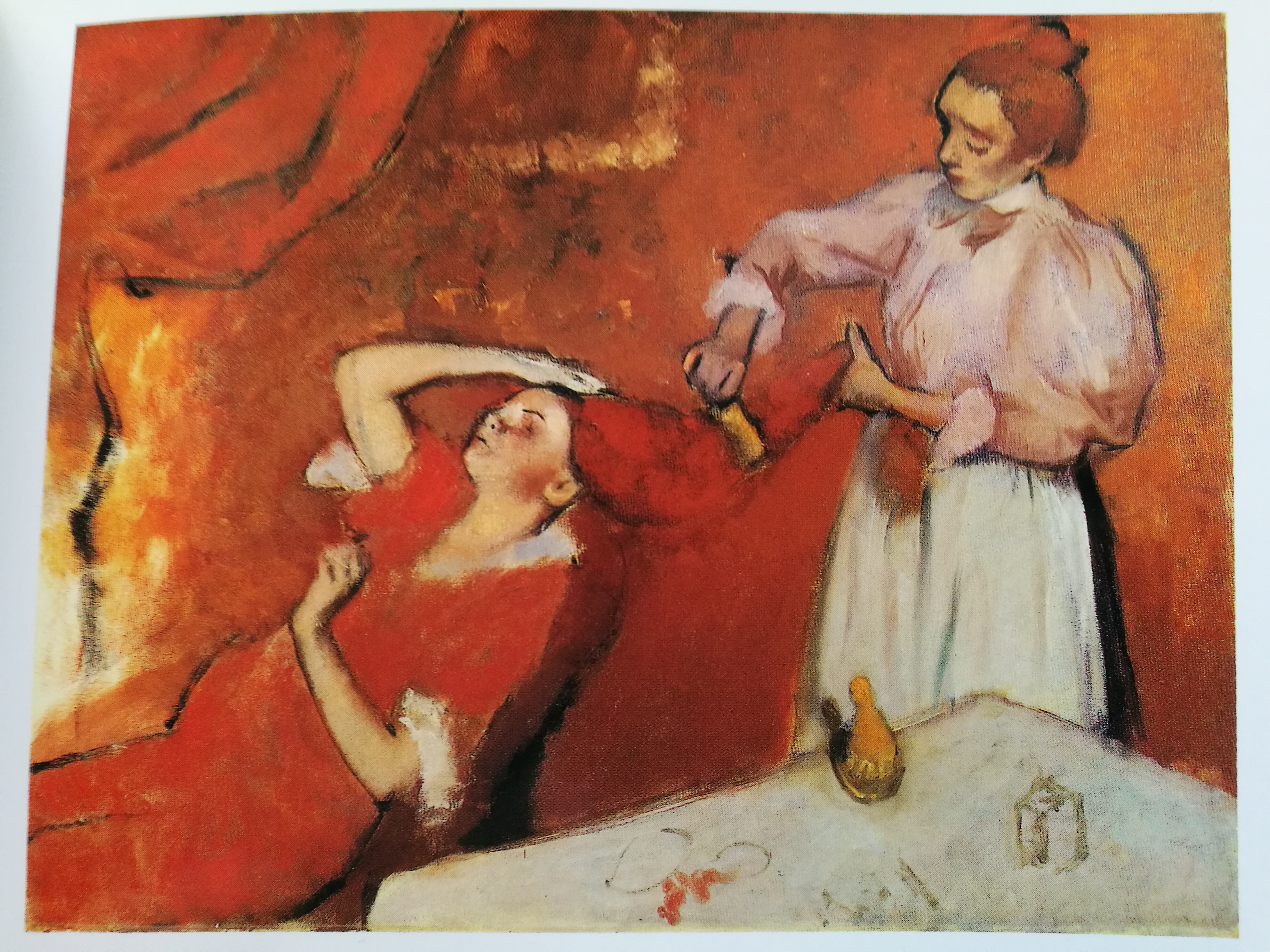 Last weekend (or the week before?) I got a post card book of Degas paintings, including Combing the Hair (1892).