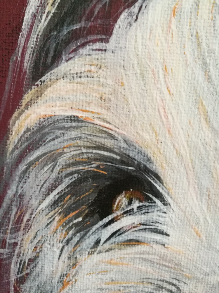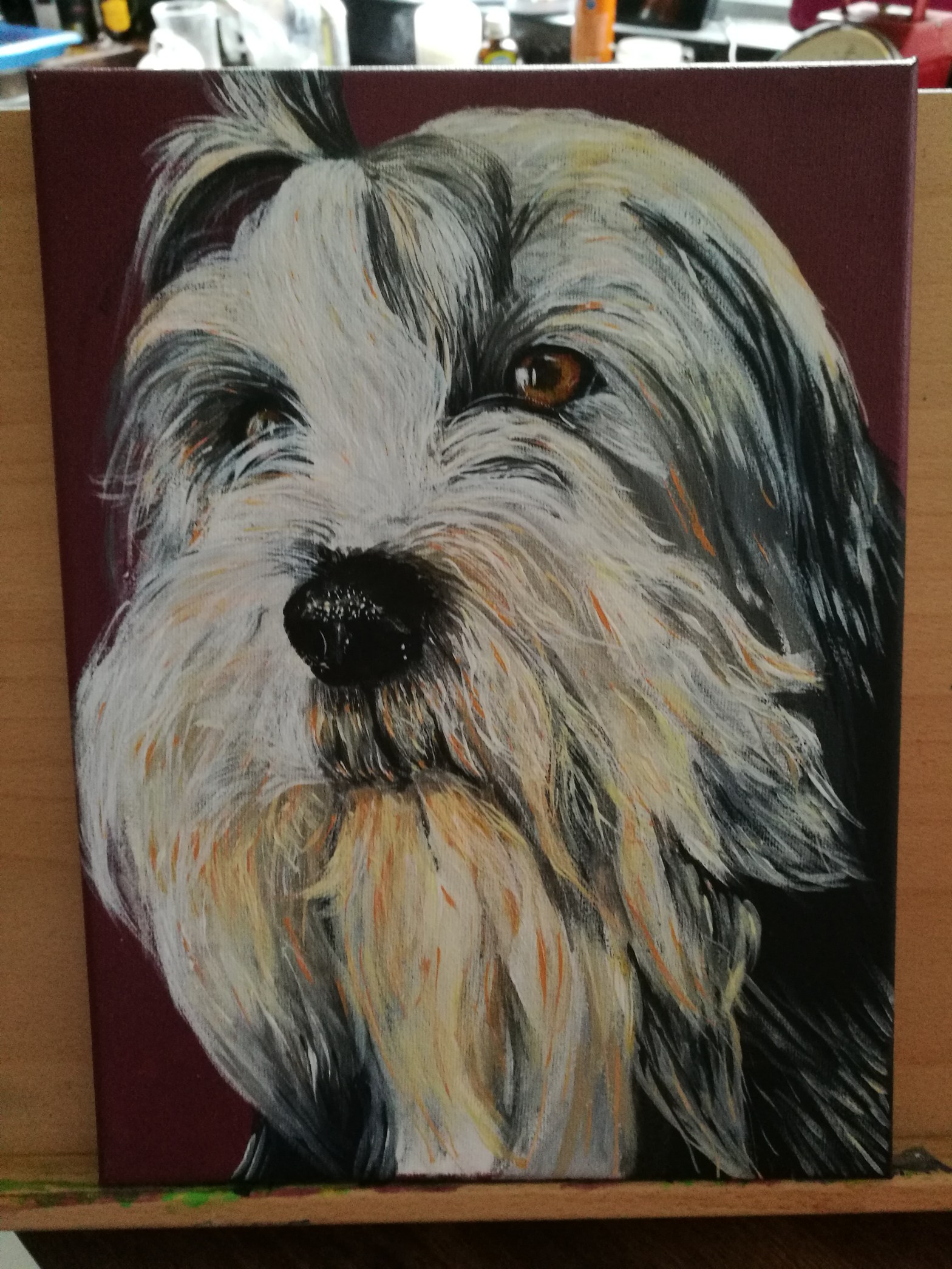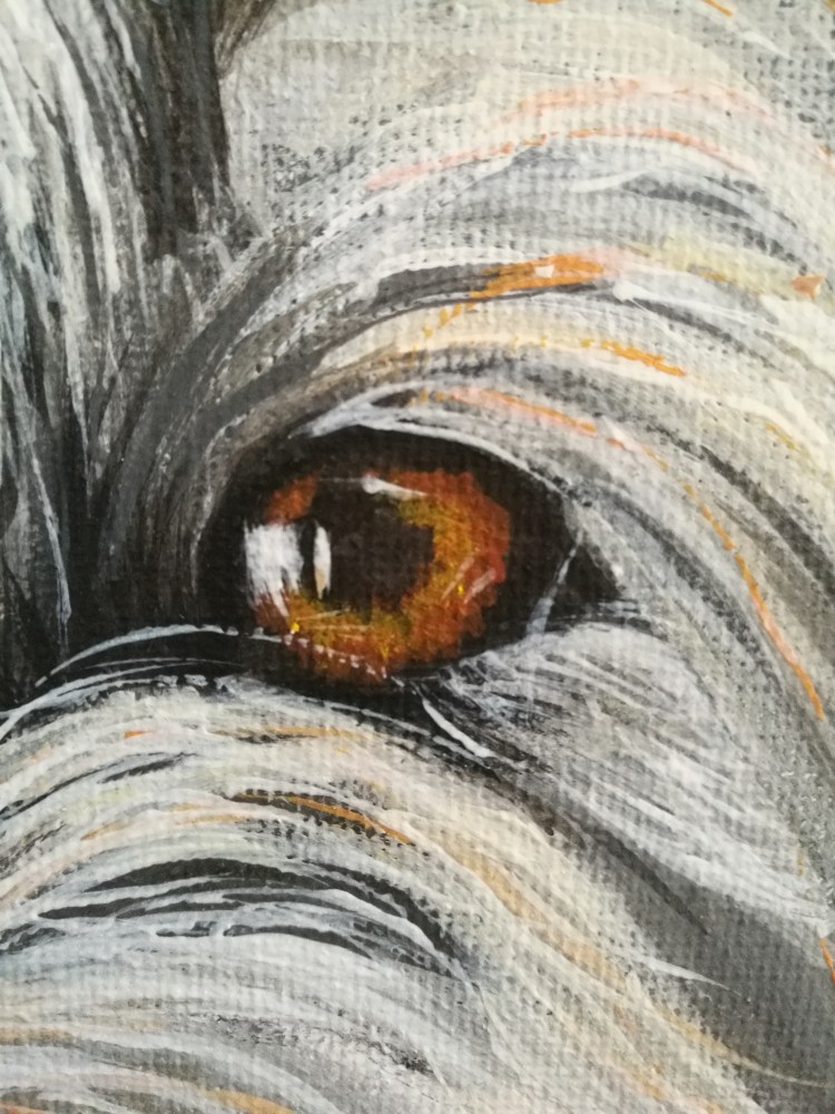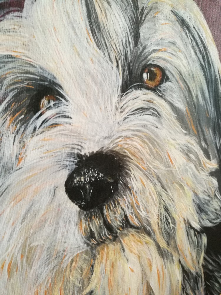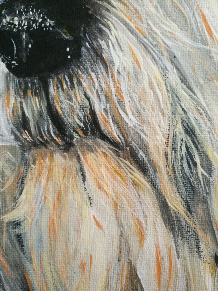 In my previous post I started working on a bearded collie portrait. I’ve carried on with it and got it to a reasonable standard to give to our friend in the Beardies in Need charity. I wasn’t sure if I’d see her again before their next event, so although there was lots more I would have liked to add, I decided to give it to her now. Here’s a few close up shots as well as the overall.