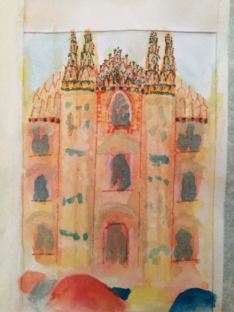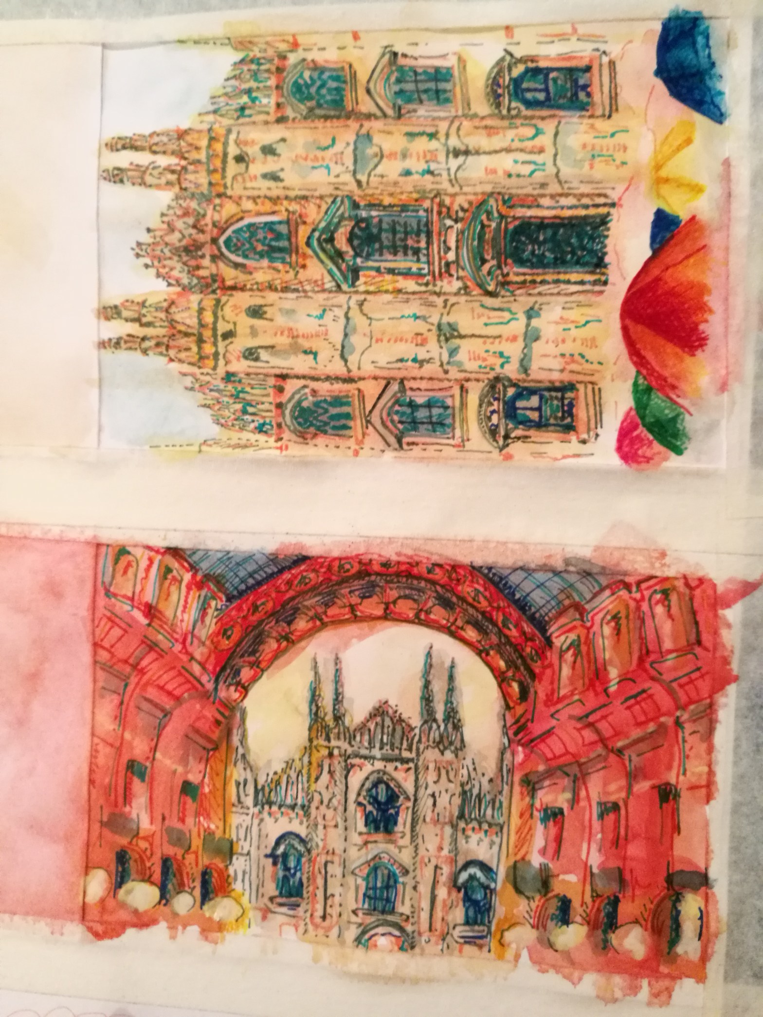 I chose two different pictures from Pinterest of Milan Cathedral. Here’s the first few layers of watercolour paint.
