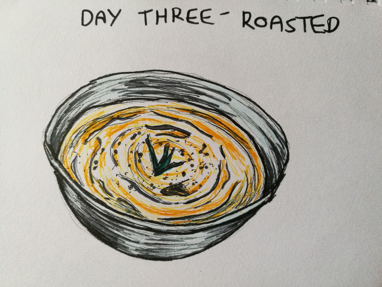 Initially I wanted to do roasted chestnuts but my sketch didn’t come out in a way I wanted. So instead, roasted butternut squash soup.