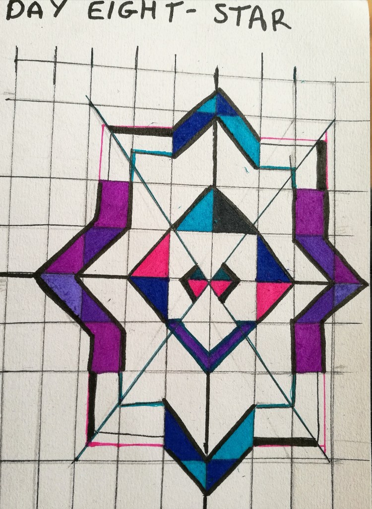 I love Islamic art so thought I’d take inspiration form them today. Of course, artists who create intricate and beautiful pieces have the best tools and mathematical reasoning skills, whereas I used a Farrow and Ball paint sample booklet as my ruler.