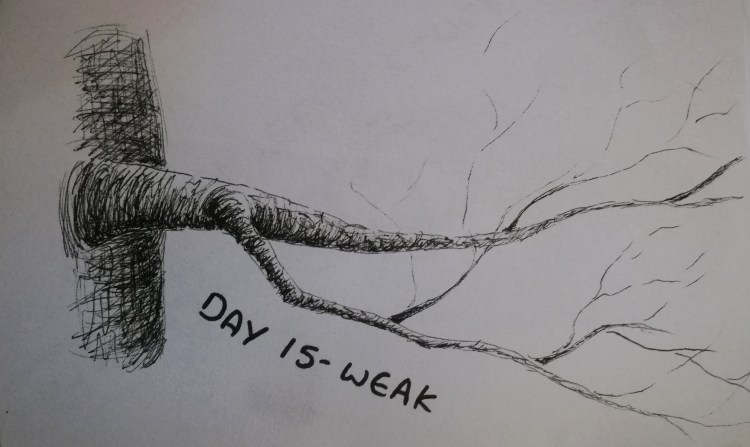 I wasn’t inspired by today’s prompt word. Instead I had a think about the things I feel confident drawing and went from there. My go to thing to draw is trees, especially branches, in fact especially where the branches get thinner and (I guess) weaker?