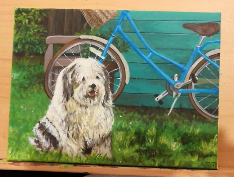 I think you’ve put so much into the bike that it becomes the subject of the painting. The dog’s fine, but it is competing with the detail of the bike and losing – put your hand over the back of the bike and look. Perhaps there are two paintings here – and just check out that front wheel again.