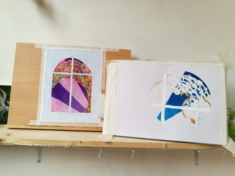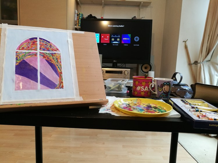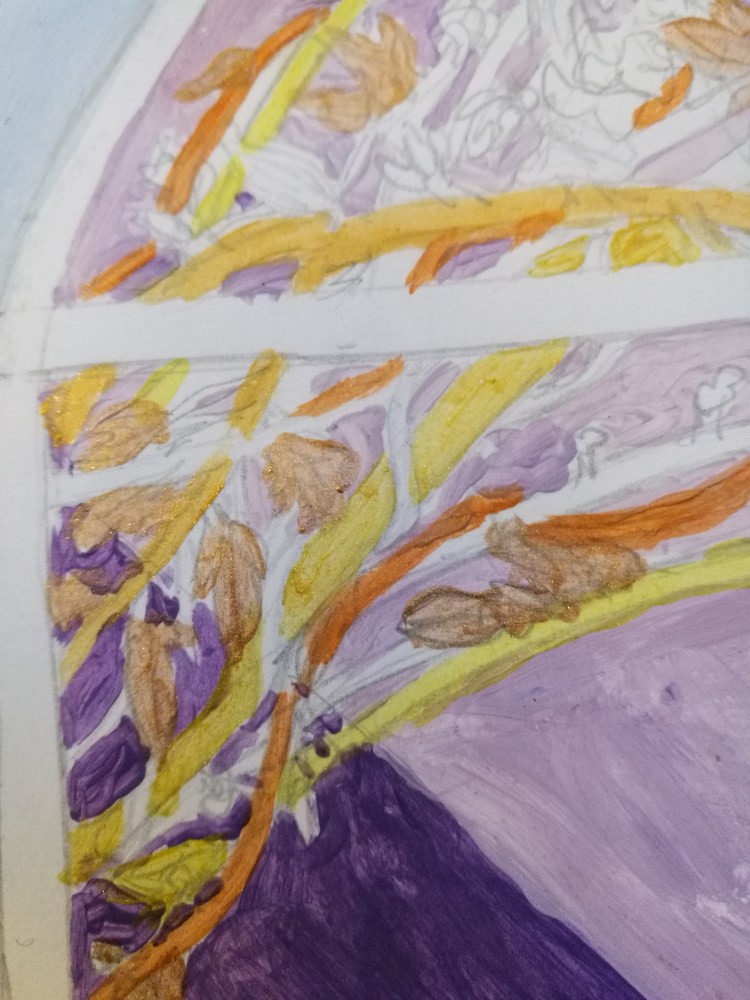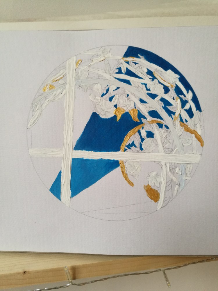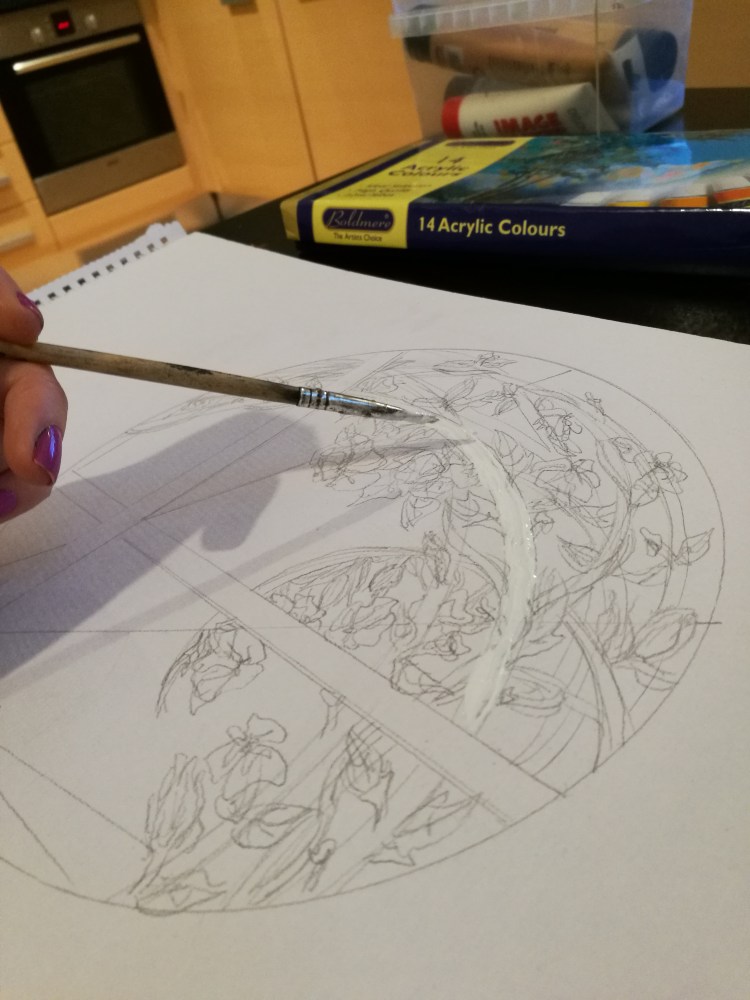 As you can see I’m taking inspiration from previous projects and trying to really master creating an art nouveau style. I want to restrict the colour palette And stop it looking so, well, primary. I’m also trying out an acrylic base and following up with oil paints, which so far I really like! It feels like there’s more scope to make changes as you go but with a gloss finish.