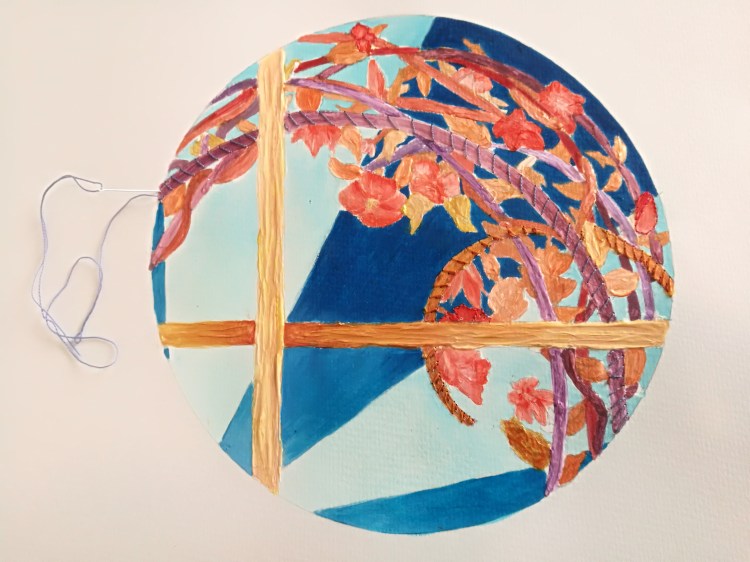 I’m sure I’ll update when any fun wedding things start happening, but in the mean time here’s an update to the projects I was working on in my last post. Some of you might remember me mentioning that I’d been doing some embroidery with my friend, so this was one of the first attempts to mix thread with paint.