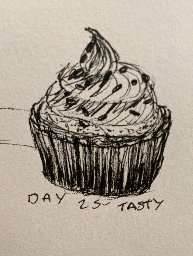 I had started a picture and then rejected it, and as today was going to be a quick one I wanted to draw over the lines, so here’s a quick cupcake over some lines.