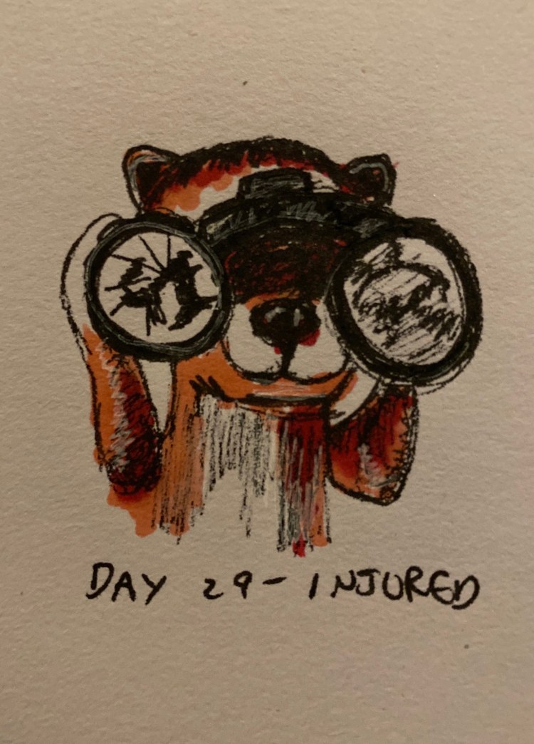 We have these little solar powered meerkats around the flat, and one has a chip on his head which is where I got the idea for the prompt ‘injured’. I wanted to draw this guy instead, so just imagined his binoculars were broken.