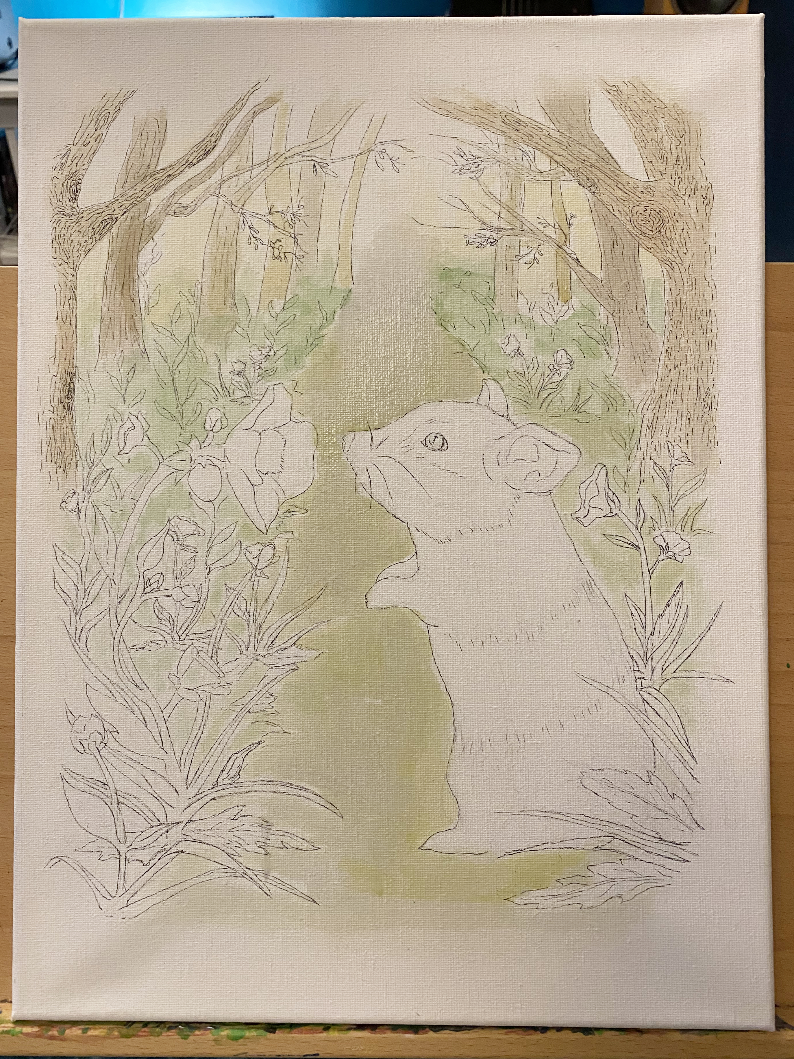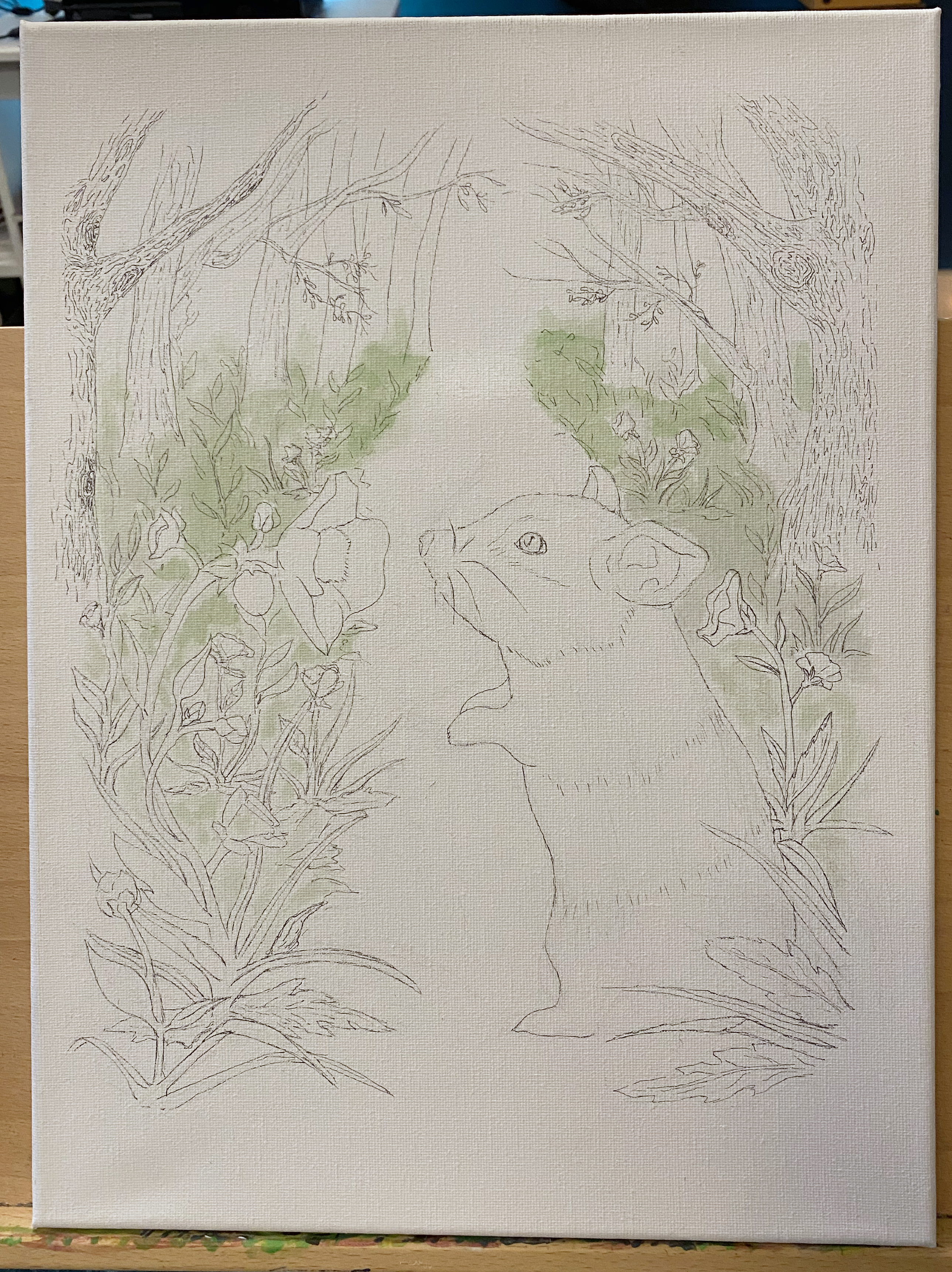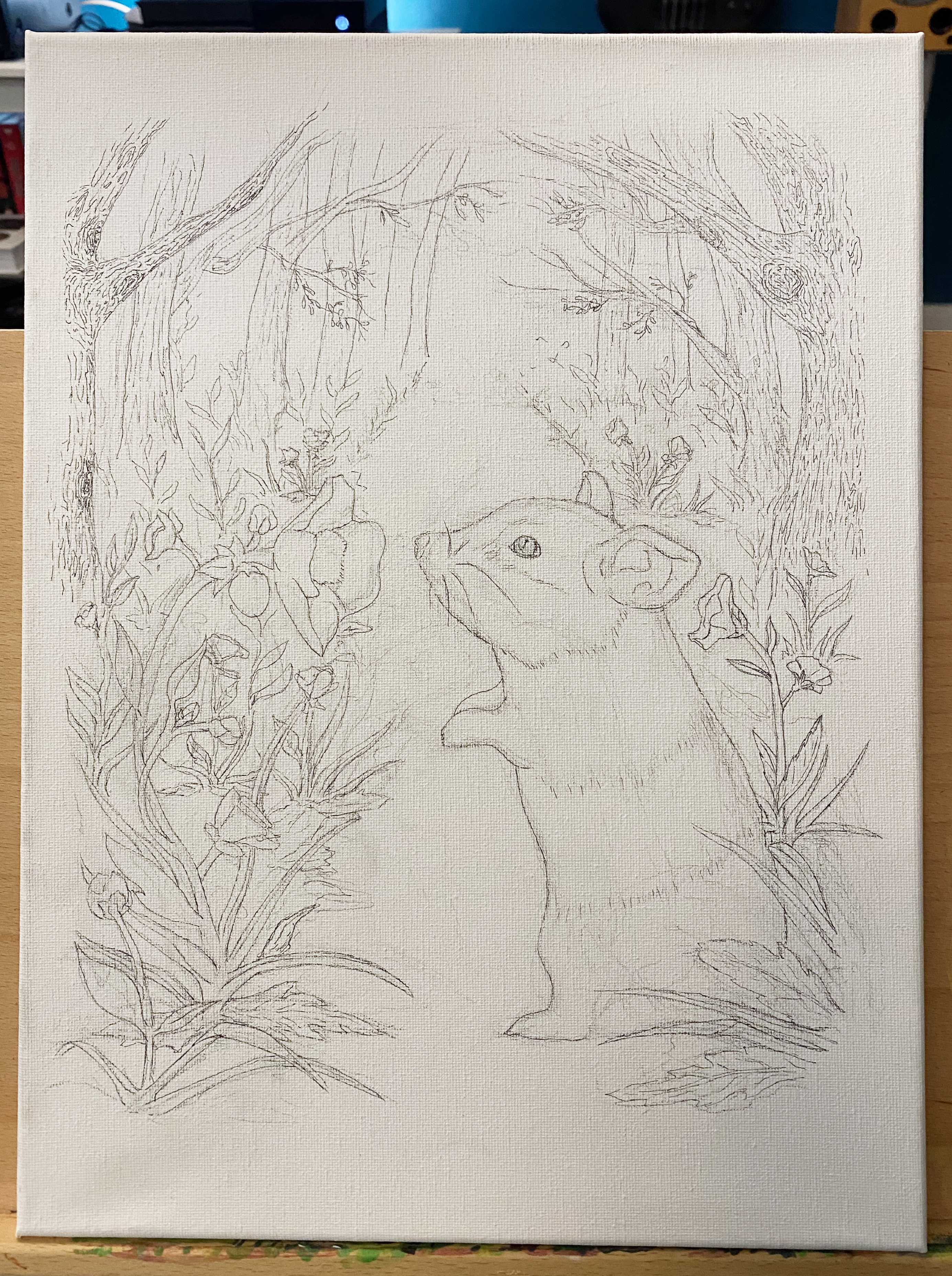 Once I was fairly happy with the design, I drew out the design (more carefully) on the (pre-prepped) canvas.