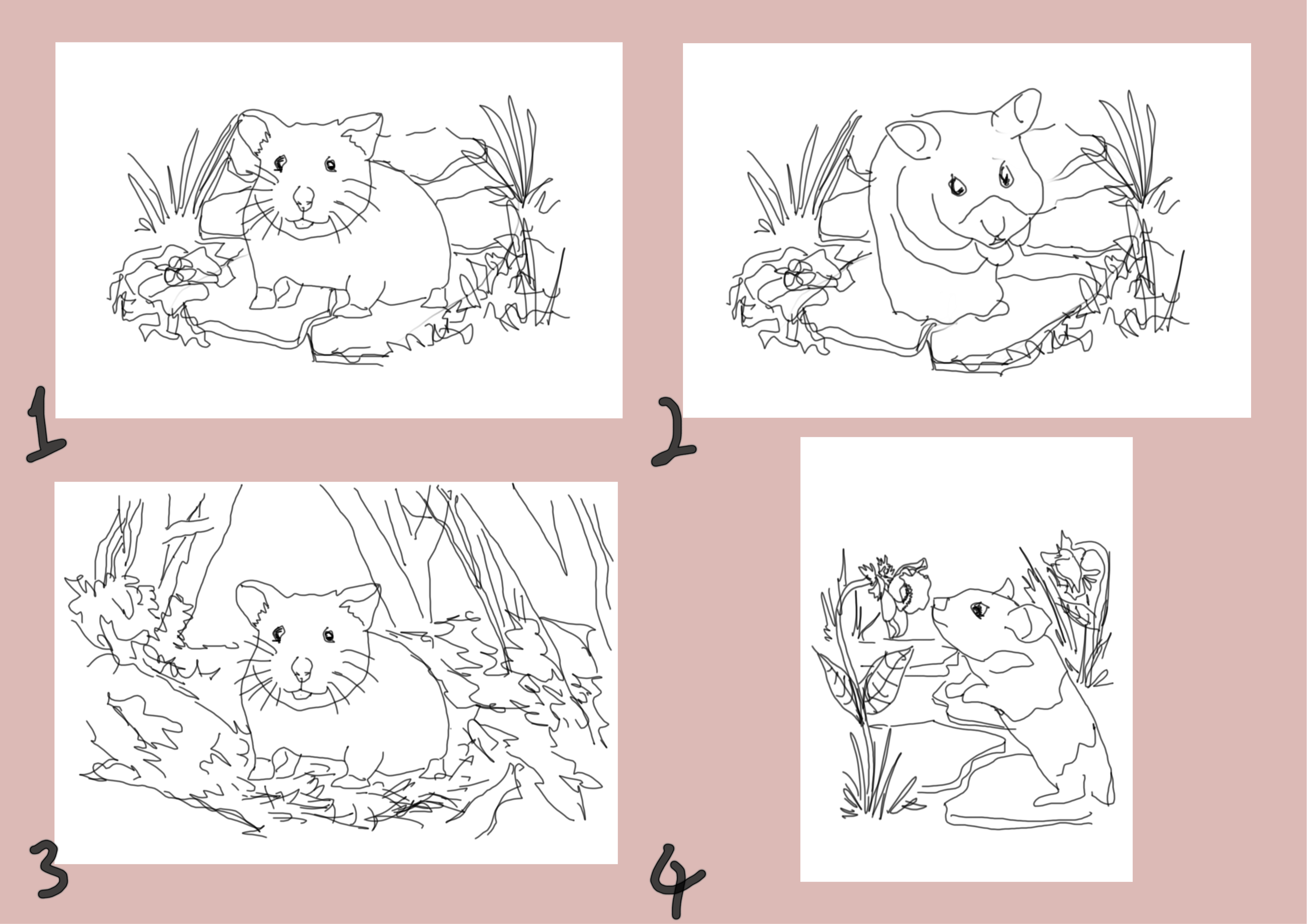 First, we decided on the composition. we ended up going for a combination of 3 and 4 so that Tessa (the hamster) was looking inquisitive and there were plenty of background details.