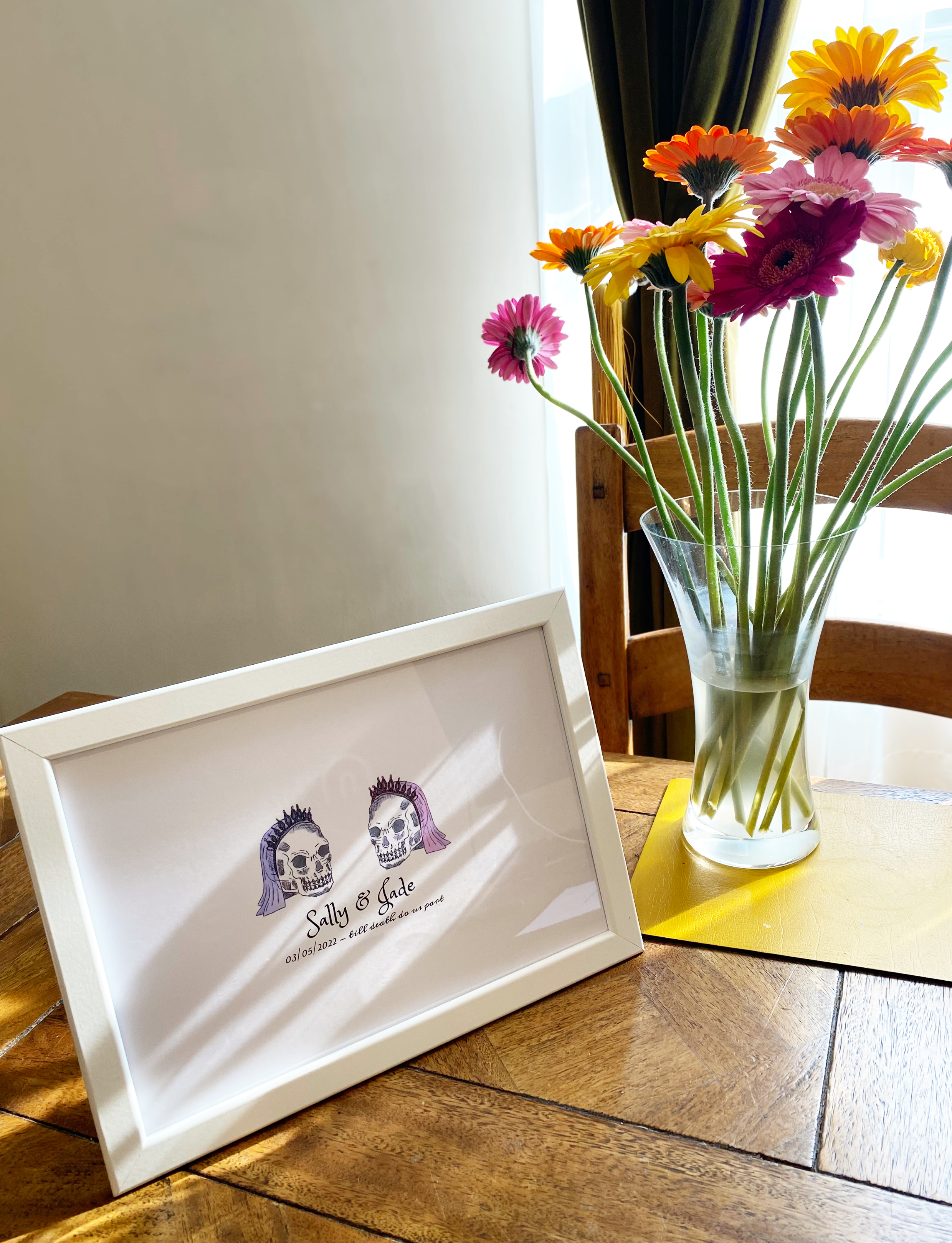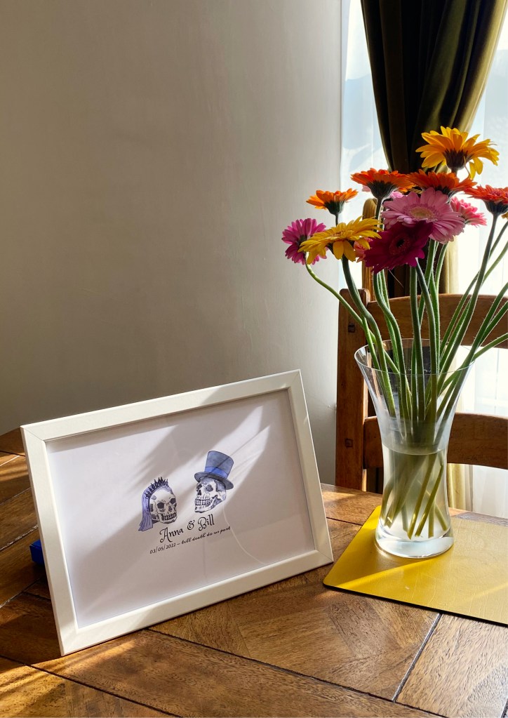 Here we have, custom wedding skulls for the alternative couple in love. The colour of the veil and hat ribbon can be customised to fit your wedding colour scheme.