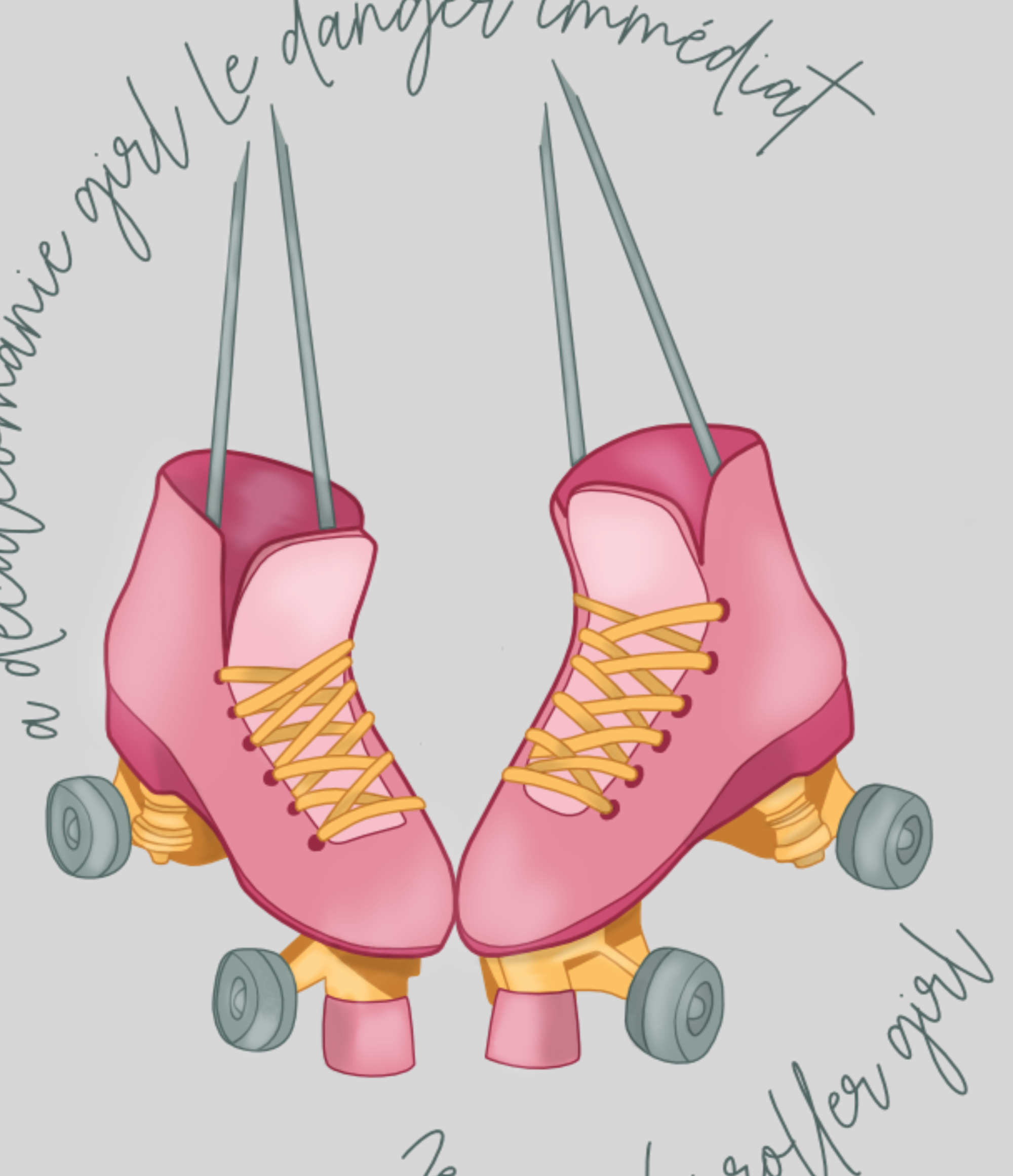 The text surrounds a digital design of some pink roller skates with green wheels and laces.