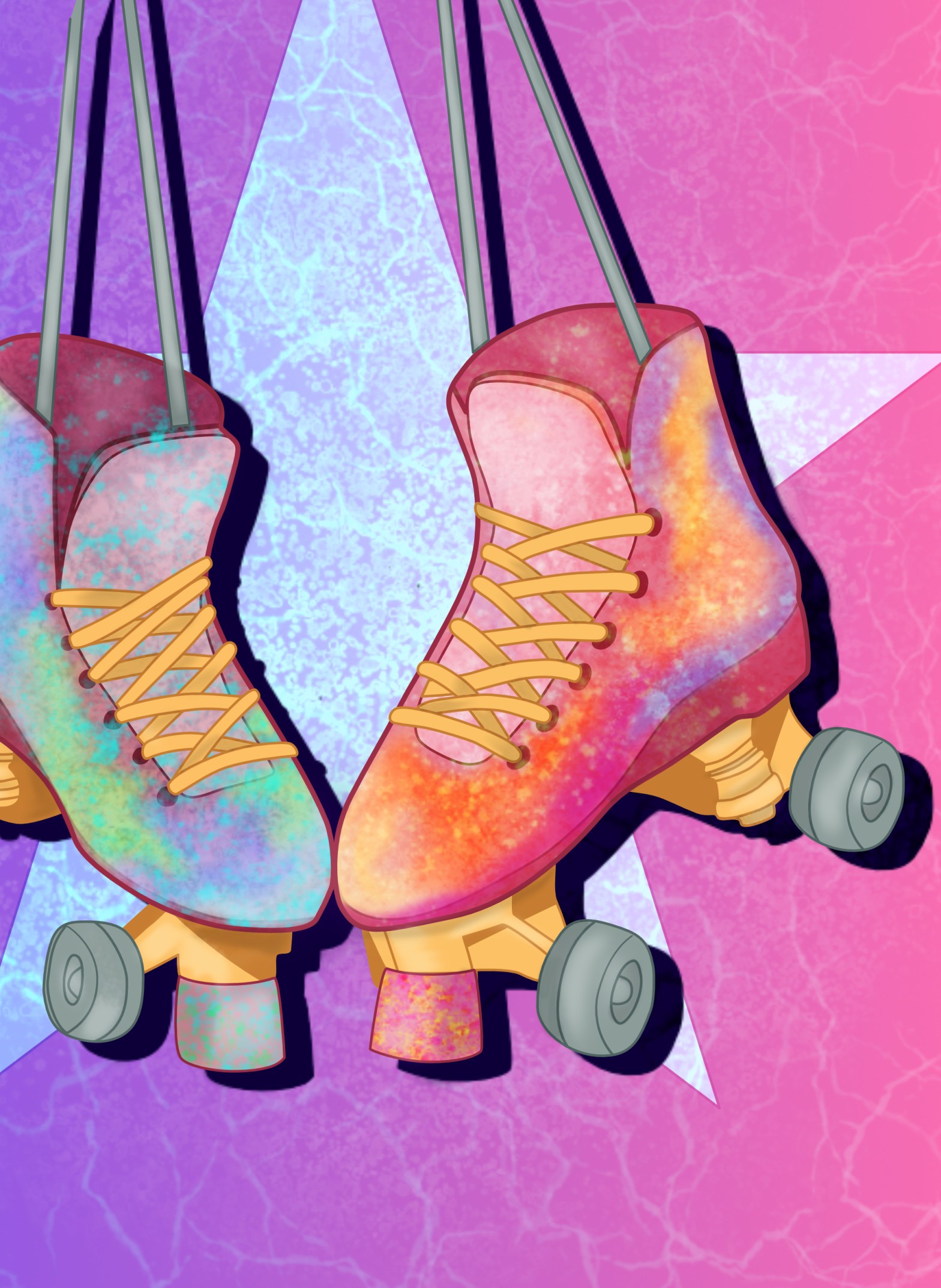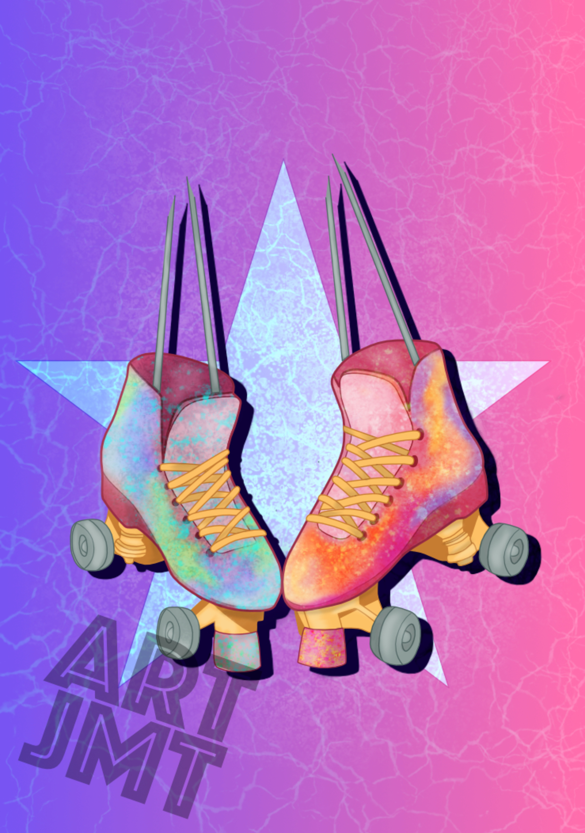 Unfortunately, I can’t resist a broad colour palette so, here we are. I’ve made a maximalist version of my roller skate print with more of an 80s vibe. I cannot BELIEVE that I haven’t used a glitter texture until now!