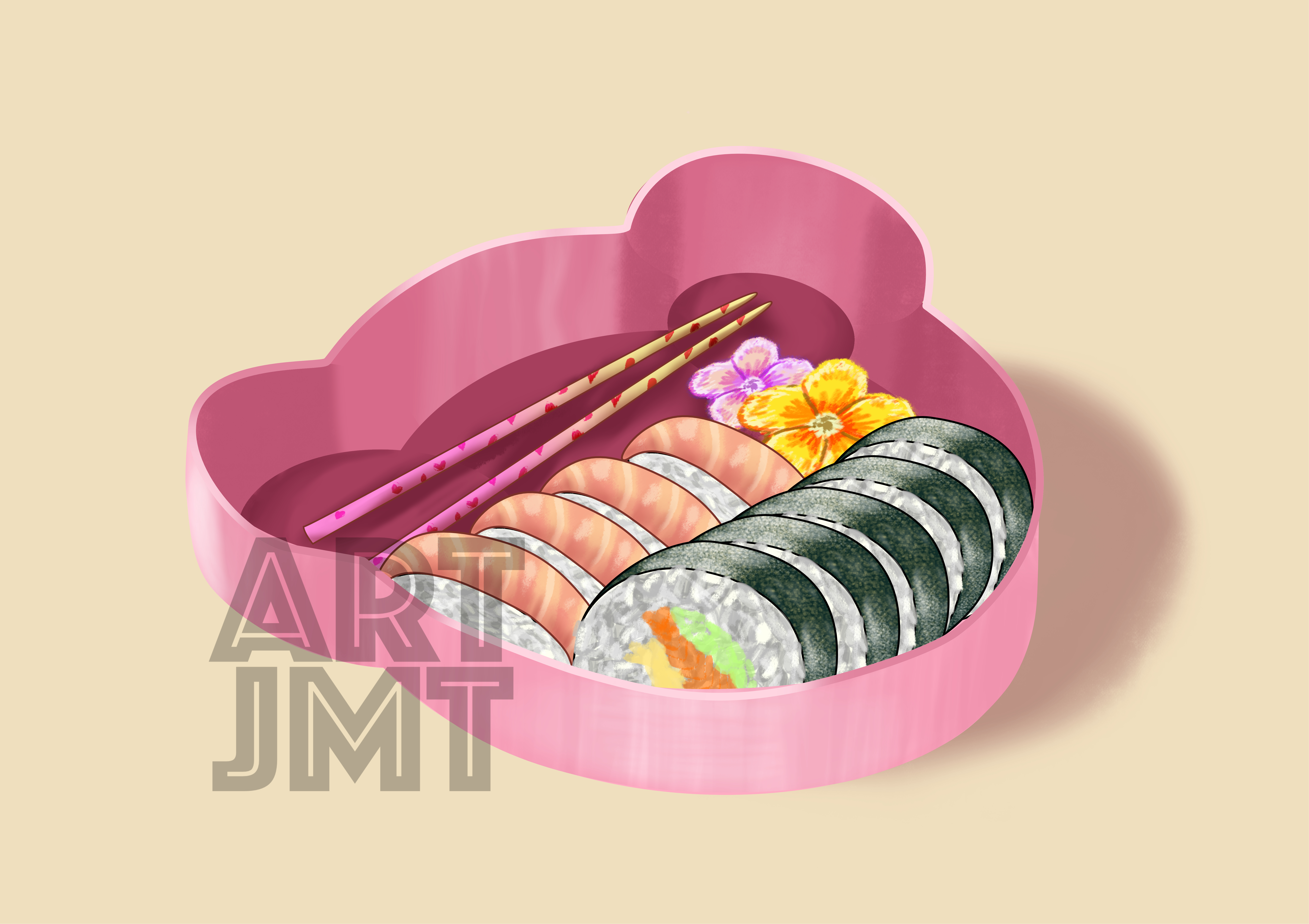 This is a digital artwork of an adorable bear-shaped bento box with different sushi inside, as well as, frankly, the cutest chopsticks that I wished really existed.
