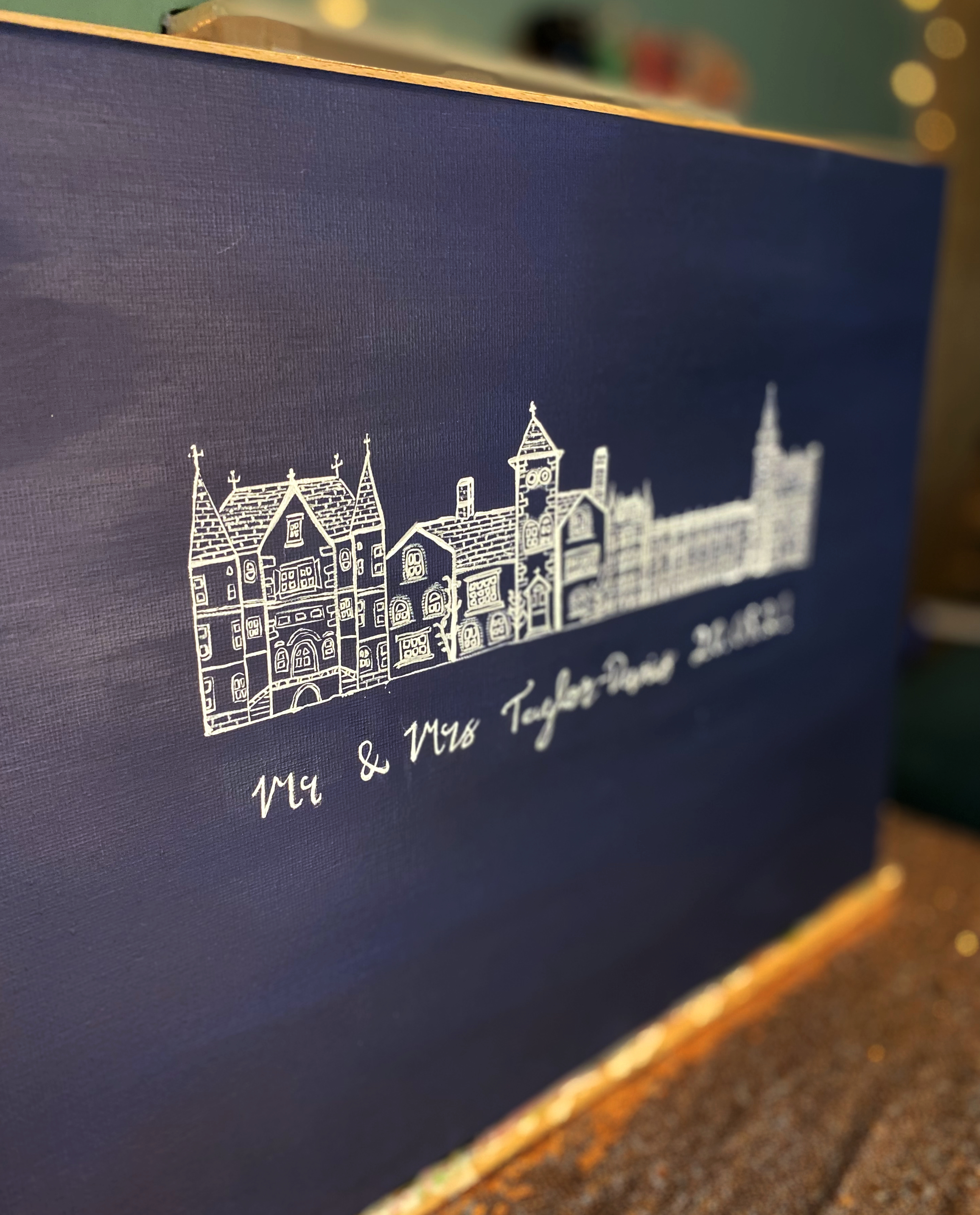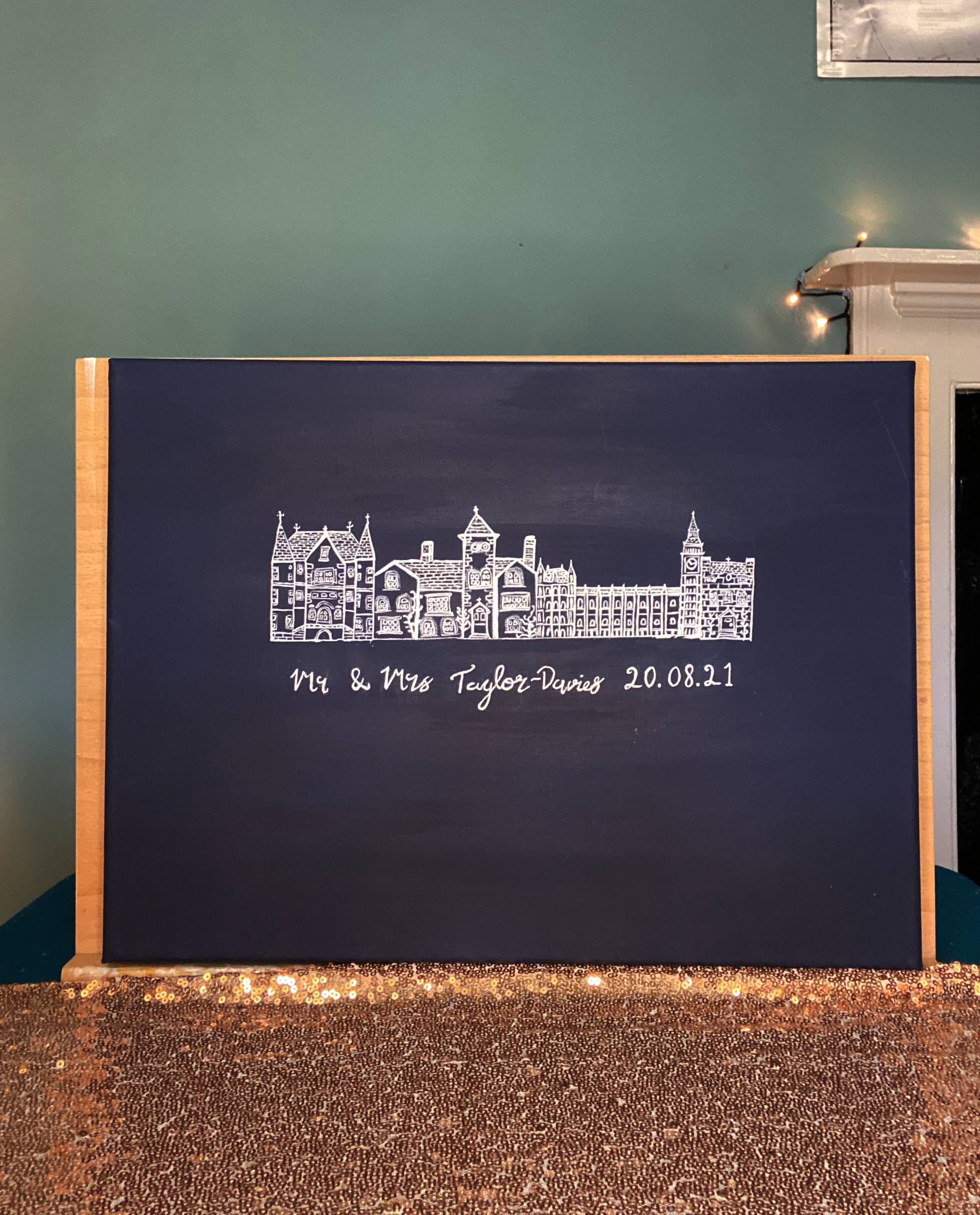 Like many people, coming up with a “paper” anniversary gift was a little challenging. Although we didn’t go for one of these custom skyline canvases (we already have one as a wedding guestbook – you can see it in my other listing) we did discuss coming up with another similar design using inverse colours – a white design on a black or navy canvas.