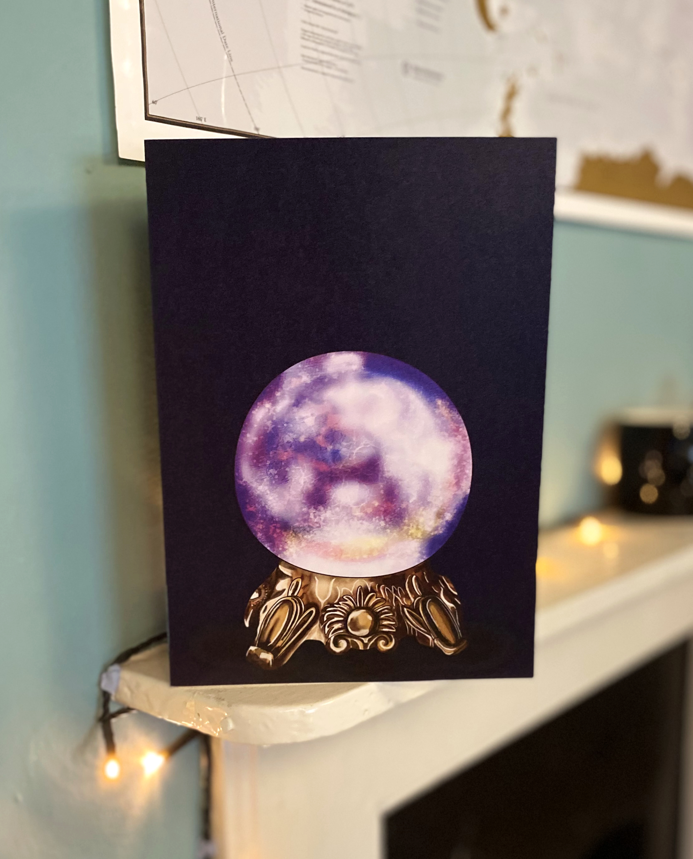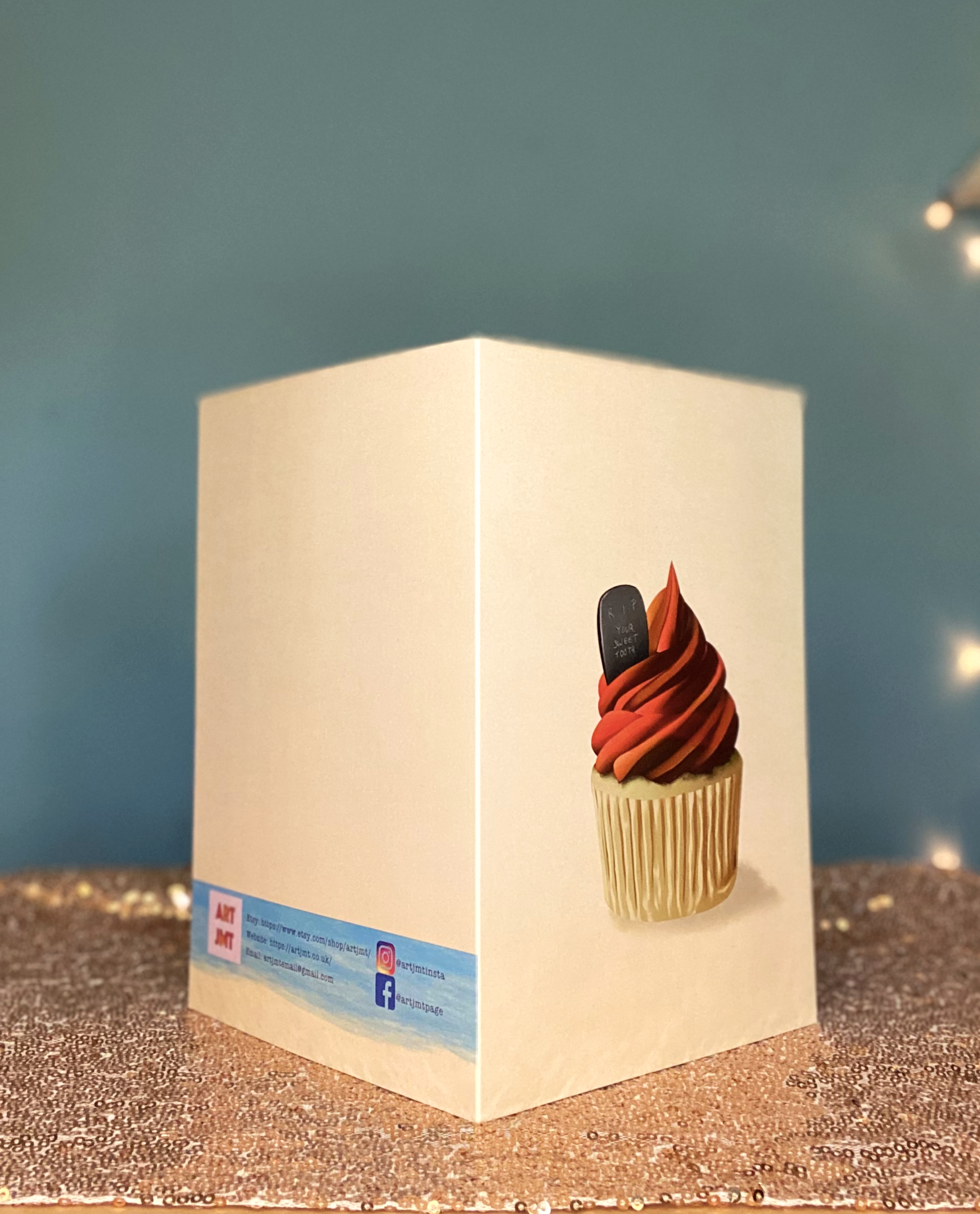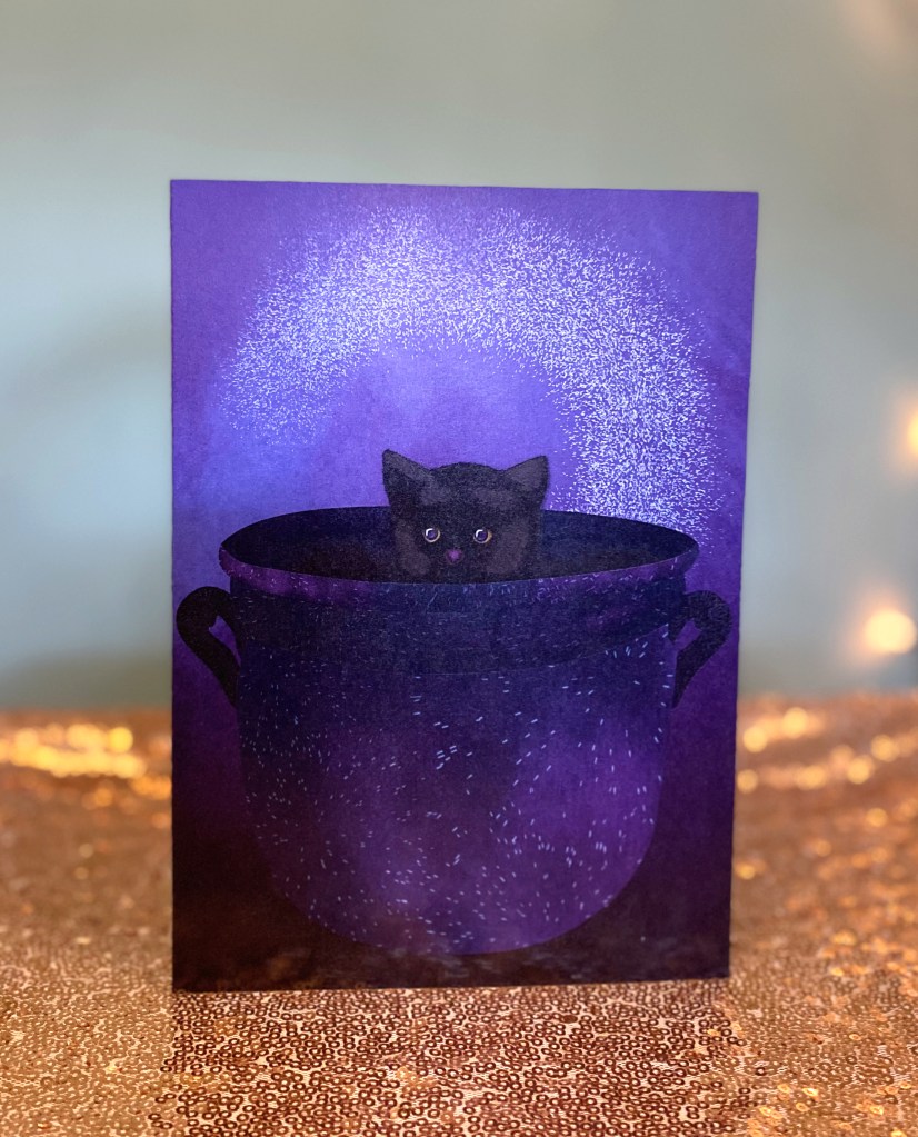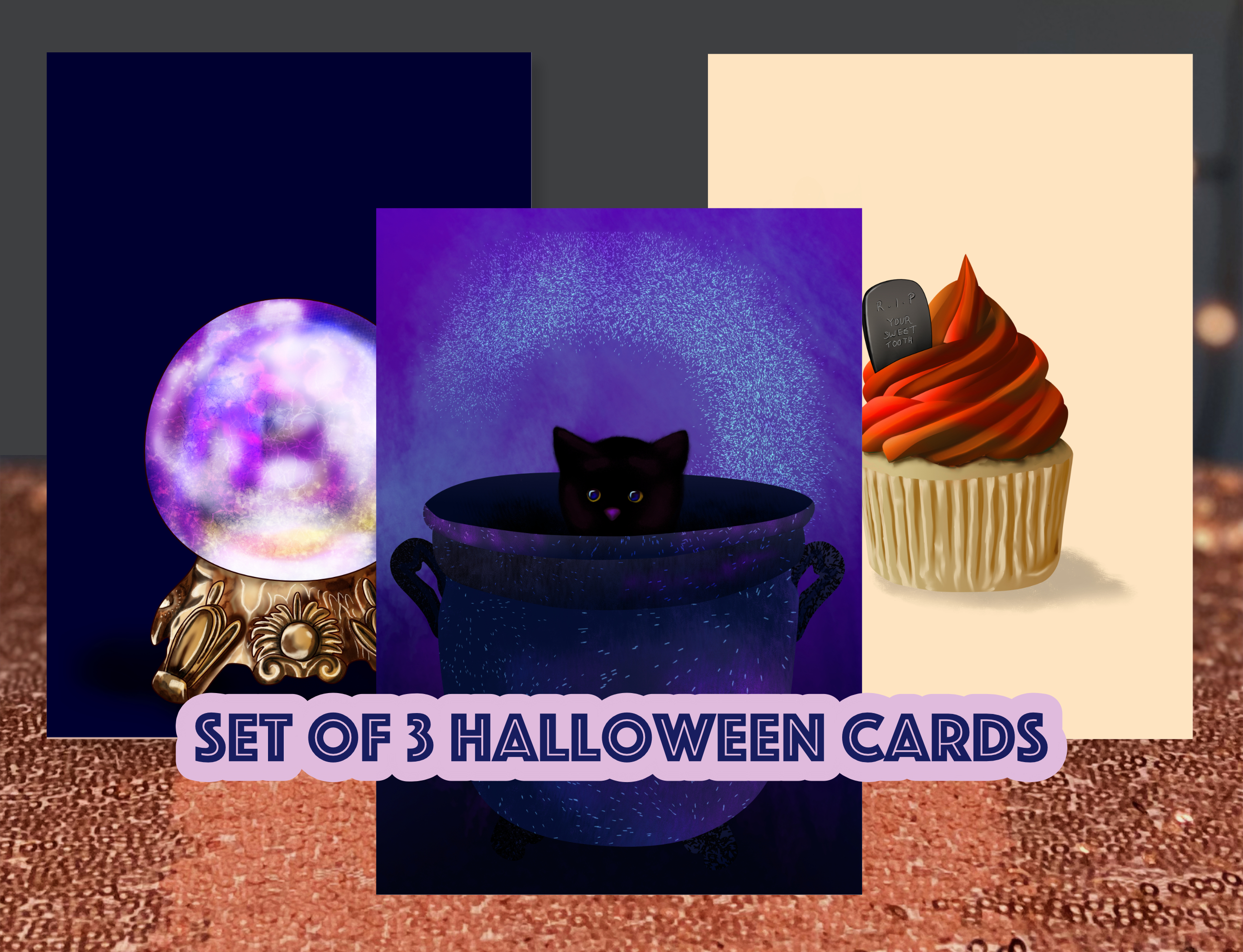 One card has a black cat in a cauldron with a magical spell cast behind it. Another is a mystical crystal ball on a beautiful stand. The final card design is a delicious cupcake with orange and red icing and a “RIP” gravestone for decoration.